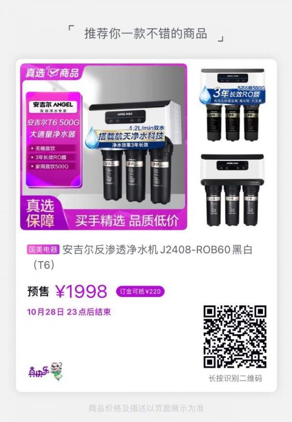 比如这款真选价1999元的安吉尔净水机,预付定金10元可抵220元,海尔十公斤洗烘一体机,预付定金100元,到手价低于2599元,全国联保,送货入户。