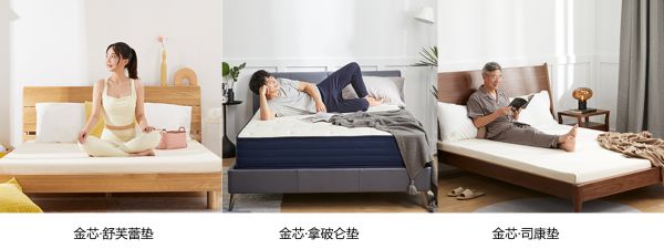 金芯系列特拉蕾乳胶床垫采用的是高端睡眠产品上才会用到的Talalay特拉蕾物理发泡乳胶,床垫亲肤层如蛋糕般蓬蓬柔软,亲肤包裹的同时也更加高弹透气;配合普通邓禄普乳胶层、独立袋装弹簧层、天然山棕层等分层材质,为不同睡感需求的用户实现不同的精细睡感;柔嫩的舒芙蕾,Q弹的拿破仑,柔韧的司康,为不同口味的你烹一只甜美的睡眠蛋糕。金芯舒芙蕾垫,选材云朵般蓬松柔软的舒芙蕾乳胶亲肤层+支撑力与弹性突出的邓禄普乳胶支撑层,能够更好地保护上班族的腰和脊椎,有效分配压力的同时还可减少过度下沉,缓解一天的工作疲劳。金芯拿破仑垫,选材舒芙蕾层+独袋静音弹簧层,均衡承托不受伴侣翻身干扰,堪称家庭首选。还有金芯司康垫,选材舒芙蕾层+手编天然山棕支撑层,可以提供自然有弹性的强支撑力,更适合老人和小孩。