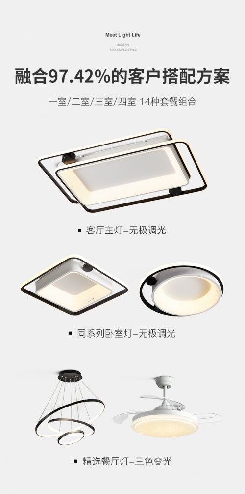 其次,五折爆款系列灯饰的功能表现力上也一样优秀。每个系列都配有可升缩吊杆适用于不同层高户型结构,用以增强层次感和延伸整体空间感。三色光源是标配,明亮的白光、舒适的中性光和温馨的暖光适用于不同家居生活场景的用光需求,同时多层次的光源选择更增加了家居空间的情感表达和氛围烘托。全屋套餐还具有智能无极调光设计,通过专属遥控器或者天猫精灵的语音控制可以随意调节亮度和色温。