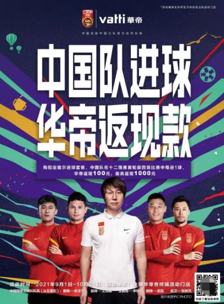 从9月1日至10月31日,凡在指定的线下终端活动门店全款购买华帝“魔尔进球套餐”的消费者,只要中国队在2022卡塔尔世界杯亚洲赛区12强赛首轮前4场比赛中每进一个球,即可获返现100元。