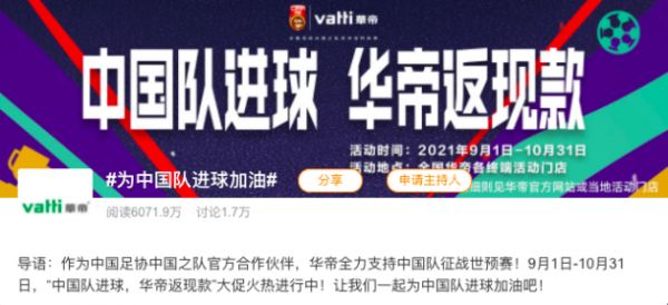 除此之外,华帝还举行#为中国队加油#话题大赛,发布原创带图微博,分享国足每个经典、高燃进球瞬间。最终,该话题大赛阅读量高达6071.8万,讨论量为1.7万,强势为中国队打call。