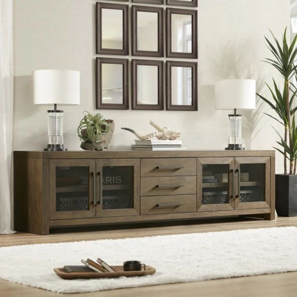 Atwood电视柜的设计,则将两者巧妙平衡,中间三层抽屉,左右两侧对开玻璃门的对称式布局,各种关于收纳的设计汇聚于此。
