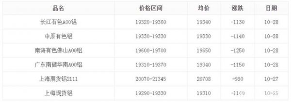 10月28日工业铝型材原料铝锭价格大跌