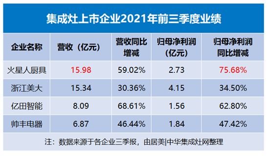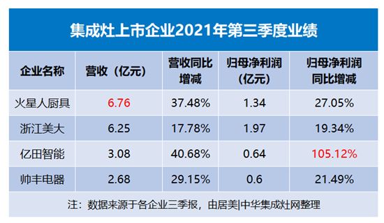 集成灶上市企业三季报发布:浙江美大营收再次被火星人超车 亿田单季度净利增长翻倍