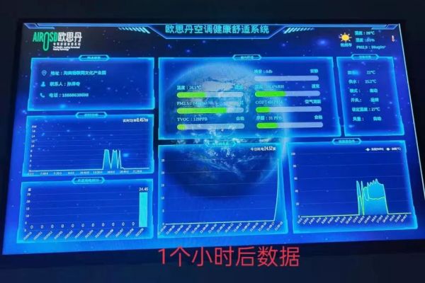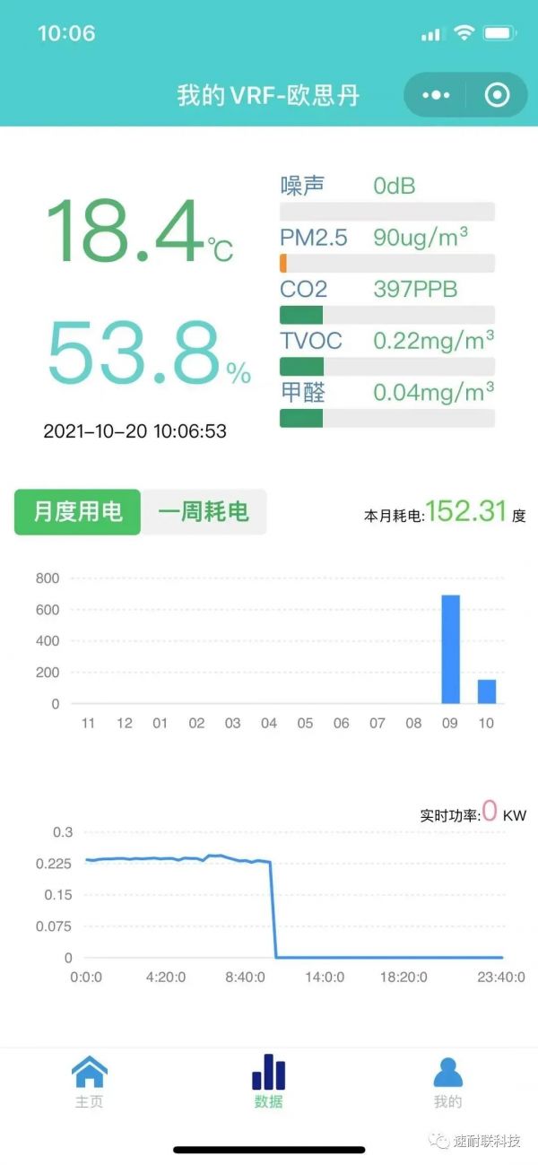 系统由多功能传感器、智能电表、机顶盒、腕带温度传感器等设备组成,实时监测室内温度、湿度、PM2.5、TVOC、CO2、甲醛与噪声等环境信息,通过智能电表实时记录空调主机的实时功率与每日、每月耗电量情况。