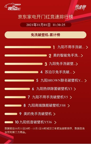 其中,九阳天空系列免洗破壁机Y536、Y1,美的免洗智能破壁机M1、美的智能全自动免洗低音破壁机300G,苏泊尔智能免洗T5破壁机等在内的免手洗破壁机产品在测评中表现优异,获得了第一批“品质认证”标签。从京东破壁机开门红竞速排行榜可以看出,京东电器“品质认证”以及《标准》的发布,对11.11期间破壁机购买的消费指导与影响力。