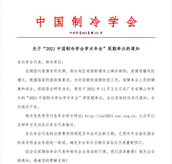 因疫情原因,11月2-5日在佛山举办的2021 中国制冷学会学术年会将延期,具体时间另行通知。已缴注册费将顺延,已预定指定酒店的房间将由会务组统一取消。详情见官网延期通知:http://car2021.car.org.cn。