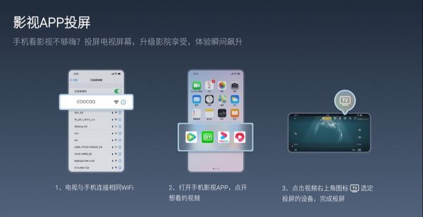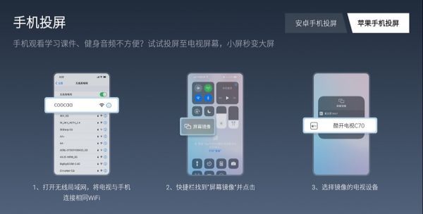 在一些细节上,58英寸酷开电视C70也做得很到位,比如其它的快速投屏功能就非常方便了,只需要将手机与电视连接到同一WiFi上,选中“屏幕镜像”中的电视设备,就能够将手机内容投屏到电视上。