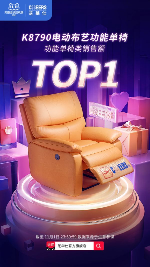 今年双十一预售期间,截止至11月1日23点59分,芝华仕K8790电动布艺功能单椅斩获功能单椅类销售额TOP1,10697电动真皮组合沙发斩获功能沙发类目销售额TOP2,50622电动布艺组合沙发斩获功能沙发类目销售额TOP1,C081真皮平移储物床斩获床类目销售额TOP1,MZ200智能按摩椅斩获按摩椅类目销售额TOP1,Z018真皮电动智能床斩获智能床类目销售额TOP1,以及爆款D026乳胶弹簧床垫斩获千元乳胶床垫类销售额TOP1。