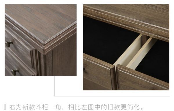 软包四周点缀有手工敲打的古咖色金属泡钉,彰显美式底蕴;斗柜抽屉处安装的古铜色金属拉手,耐腐耐磨,造型复古经典;所有抽屉导轨皆为榉木实木,承重性好,精细打磨后顺滑耐用。