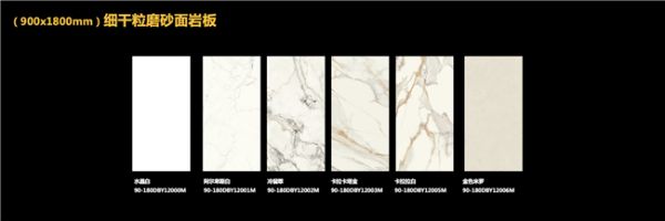 其次是900-2700mm的岩板系列,分别有细干粒磨砂面台面风格产品、雕刻质感面一片到顶护墙板风格产品、以及全抛亮面高端大理石风格产品。