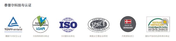 另外,泰普尔还在专业的认证机构中取得了各种证书,用以符合健康、安全、环保和技术的各项标准。例如LGA ( 泰普尔材质污染物检测合格证书),TUV(德国安全认证),Oeko-Tex(国际环保纺织品检测合格证)、ISO9001(质量体系认证证书)、ISO14001(环境体系认证证书)、ISO18001(职业健康安全管理体系认证证书)和太空基金会认证。