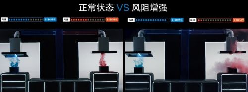对比普通定频油烟机(红色烟雾),老板变频大吸力油烟机(蓝色烟雾)在风阻增强时,依然能达到最佳吸油烟机效果