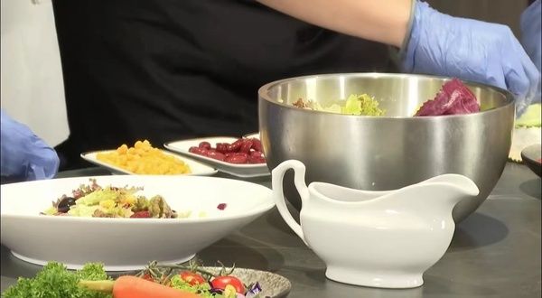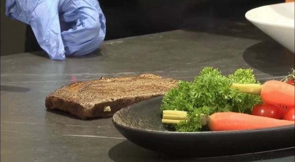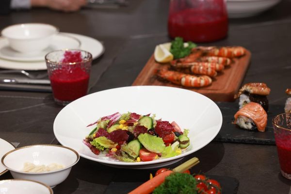 在近千度高温喷枪烹考下,炙烤大虾和岩烤牛排火热出炉,台面遇烧灼不变色、不冒烟,依旧崭新如初。另一边,素汤面、元气满满的手握寿司、田园风光的色拉和“岩”值天花板的果蔬汁接连呈现,经过各种锋利刮擦,台面没有任何划痕,多道特色菜肴都在岩板厨房轻松搞定。