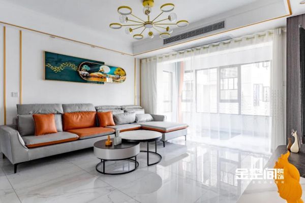 主调灰色系列的沙发再加上部分一些的橙色点缀,沙发前端搭配上圆形茶几和独特弧形设计,勾勒出柔和又独具线条美的画面,步入其中,享受着窗外带来的微光,明暗交织的光影在地板上流淌,整个客厅宛若一幅轻盈自然又附带着沉稳宁静的画卷。电视墙采用的大面积的大理石铺贴,更为有整体性。旁边再做上一个展示柜,摆上一些自己喜爱的小物件,平时看到都能对此爱意满满。