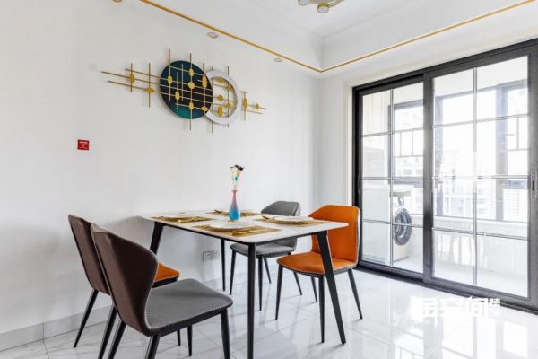 餐厅旁采用的是透明的推拉门的设计,太阳光可以更好的穿透进入,让整个餐厅光感十足,用餐时的心情也会随之而变化。餐座椅脚的斜切面设计,让户主在打扫时也更加方便,为了防止家中孩子的碰撞,特意选用桌角为圆弧形的餐桌,实用性提高的同时也更为安全。墙壁的金属装饰条选用的橙色系列与金色装饰物件的颜色两者之间也是相呼应的,使得整个空间的颜色都更为统一。