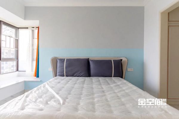 卧室作为缓解一整天疲惫的定居所,宁静和舒适是整个空间的主题。在蓝色与灰色墙面的铺垫下,一张现代风大床,给整个空间添置了一丝惬意的调性。在飘窗上铺上小毛毯,闲暇无事时,待在旁边飘窗处可以更好的俯瞰下方的全貌,给生活增添些许情调。
