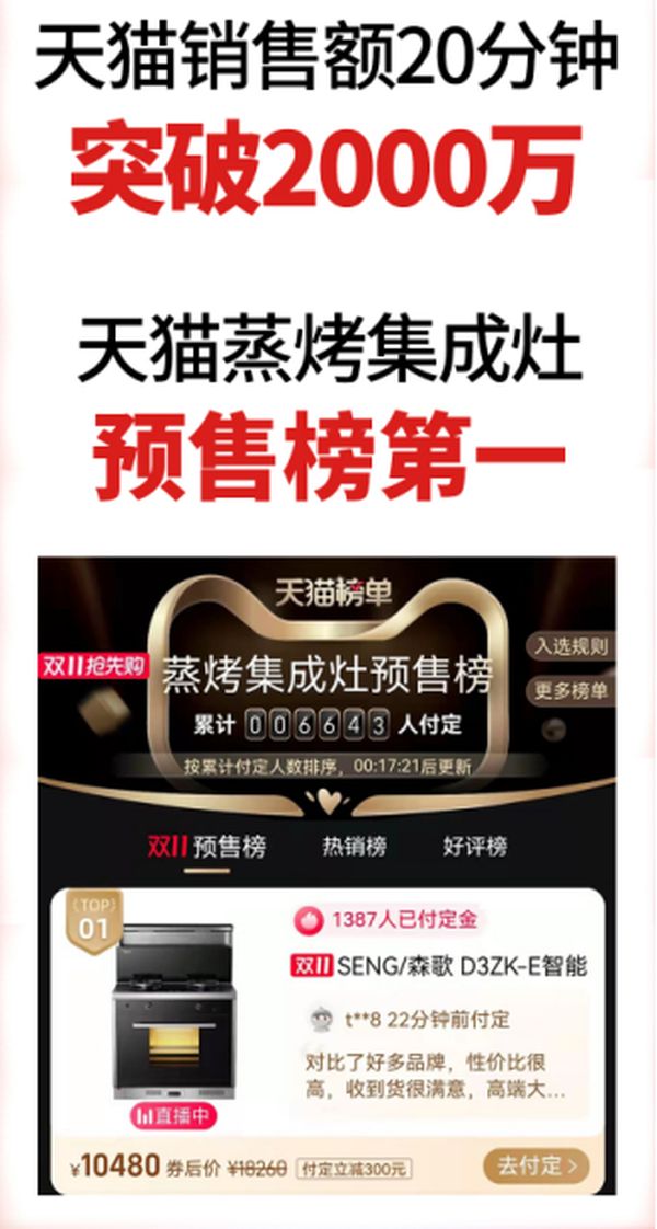 随着规则的改变,双11战线的拉长,无疑给足了消费者优惠下单的反应时间,也让品牌间的硝烟更加浓厚。在此期间,催生出多个现象级爆款。集成灶品类下,森歌就是爆款收割机中的那个佼佼者。