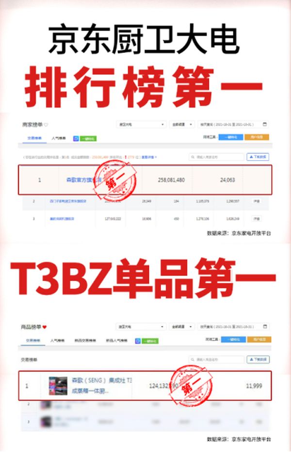 三款爆品齐发力,可谓威力无穷,特别是当多年销冠T3BZ遇上了实力新宠T3BZ,双剑合璧,一举帮助森歌官方旗舰店再次拿下京东厨卫大店榜和新兴厨电榜,双榜第一!