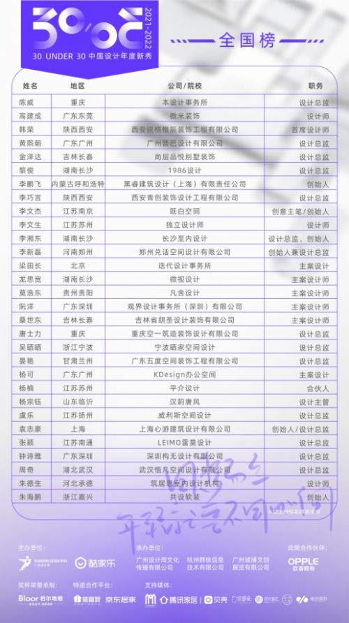 30 UNDER 30由杰出的云设计软件平台酷家乐联合广州设计周首度发起,欧普照明作为战略合作伙伴。旨在以前瞻性的眼光发现即将对室内设计行业带来重大影响的年轻创业者、变革者和开拓者,促进新锐设计力量的联动成长,展示推动中国室内设计领域发展前进的后备军力量。这也成为对于针对30岁以下的执业设计师评选。