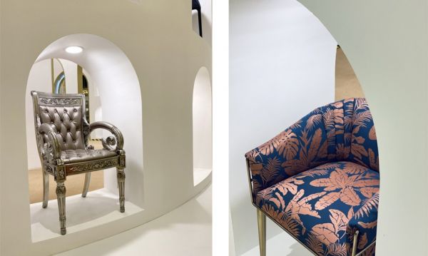 本届米兰展将经典的欧洲文化和建筑风格元素融入其中,主展厅呈现了一座mini古罗马斗兽场,多摩仕奥瑞家居在主要位置向观众展示意大利两位知名设计师的作品。设计师朱塞佩.维加诺(Giuseppe Viganò)为意大利知名家具品牌Visionnaire设计的Aminta扶手椅简约、舒适,其金色的管状结构承托着如床具般柔软的填充。阔叶植物的花纹延续了Visionnaire近年来走进热带雨林的自然主题,藏青和洋红的配色让这把休闲椅拥有了一丝异域文化的色彩。