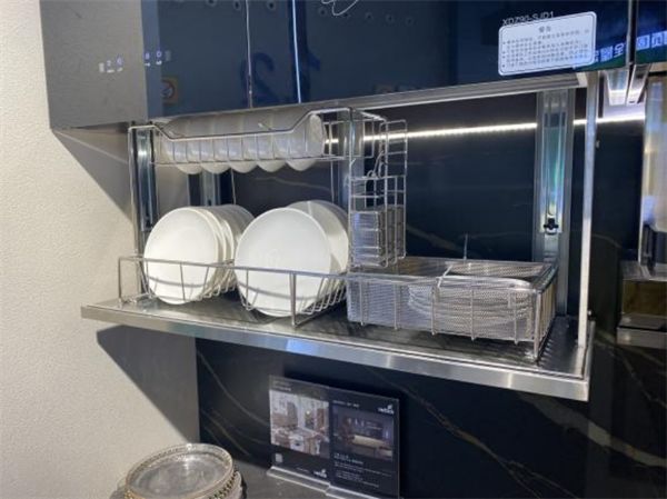 电动升降储物架和消毒柜均采用201不锈钢外箱和正门左右对开门形式,结合可升降的门体层架结构,自动控制门体的上升和下降,很好的解决了下厨过程中,偶尔腾不出手的难题,方便拿取碗碟盛放烹饪好的菜肴。
