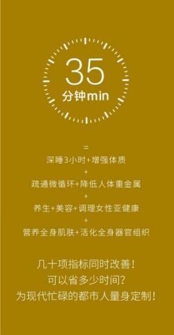 一次仅仅花35分钟,就能同时改善多项亚健康问题,每一次调理后都会让你不再疲劳,精神焕发,脸色红润有光泽,是一种养生兼顾美容的好方法。
