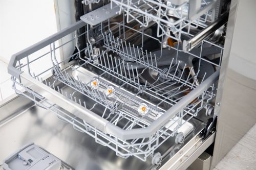 第一层是比较浅的多功能搁置架,用来摆放筷子、勺子等餐具,第二层上碗篮主要用来洗碗、料碟之类的餐具,两侧可摆放各种杯子,最下面的下碗篮用来洗盘子、汤碗、鱼盘和炒锅等大件餐具。总容量14套,这个说法是按照14人进餐的标准餐具来说的,但是肉眼可见内部空间真的非常大,如果能调整内部格局大锅大盆肯定是能痛快洗的。