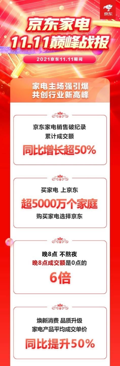 伴随11月11日24点的到来,“晚8点不熬夜”的京东11.11完美收官。京东也向年末的家电市场“大考”交上了一份亮眼的成绩单,2021京东11.11期间,京东家电销售破纪录,累计成交额同比增长超50%;有超过5000万家庭选择在京东购买家电,凸显了京东的家电主场地位。同时,在“晚8点,不熬夜”的焕新体验影响下,消费者释放出了强劲购买力,晚8点成交额是0点的6倍。不仅如此,在消费升级的带动下,高品质家电受到热捧,家电产品平均成交单价同比提升50%。这个11.11,京东家电用一个又一个数据再次刷新记录,引领行业不断焕新升级。