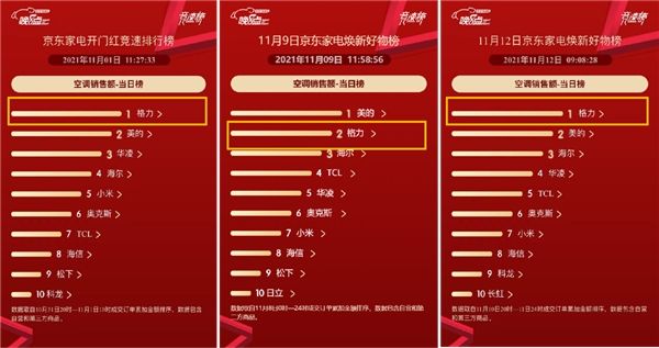 得益于“超级焕新计划”的助力,京东11.11期间,众多趋势品和新奇特家电备受消费者喜爱,这也直接促进相关品牌实现了持续性增长,成为广大消费者最为青睐的品牌。以格力为例,自京东家电11.11开启后,格力一直占据空调排行榜榜首,直到11月9日,其不敌美的攻势,暂失冠军席位,但实力强劲的格力不甘示弱,11月10日晚8点京东家电11.11高潮开启后,格力除甲醛空调成交额环比增长350%,趋势品类产品的爆卖让格力重回空调榜榜首,并锁定当日榜、累计榜双料冠军。