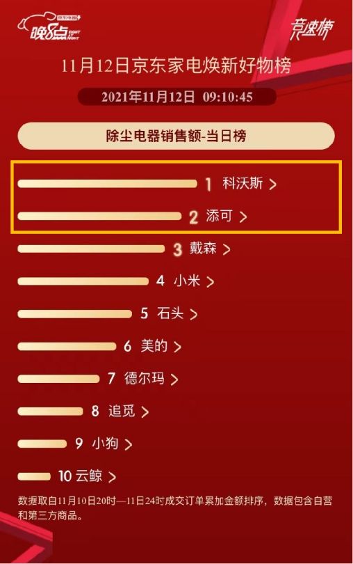 随着生活品质的提升,消费者的需求逐渐呈现细分化、精专化,更多能够满足消费者品质需求的家电备受青睐。据京东家电统计数据显示,11.11期间,分区洗洗衣机成交额同比增长超5倍;蒸烤一体集成灶成交额是去年同期的4倍;洗地机成交额同比增长超5倍;选购自清洗扫地机器人用户占比超5成。随着新兴品类的火爆,相关品牌也实现了高速增长,其中科沃斯品牌成交额同比去年增长3倍;添可洗地机成交额同比增长6倍,这也直接影响了京东家电11.11竞速榜的排位,在除尘电器榜单中,科沃斯、添可稳居冠军、亚军席位。