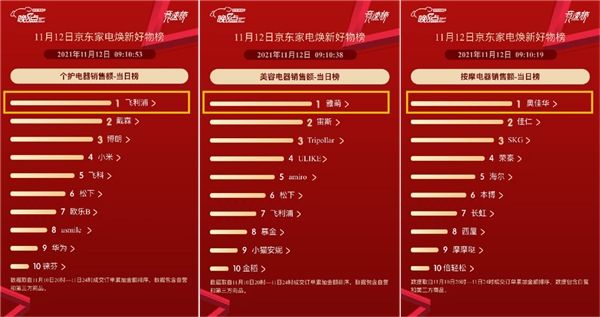 在持续走红的家电品类中,小家电可谓是赢得了年轻人的芳心。据11月5日京东家电品类日统计数据显示,个护、美容、按摩器品类整体成交额同比增长4.6倍。在消费红利的助力下,飞利浦、雅萌、奥佳华品牌分别赢得了京东家电11.11个护电器、美容电器、按摩电器销售榜冠军,实力霸榜。