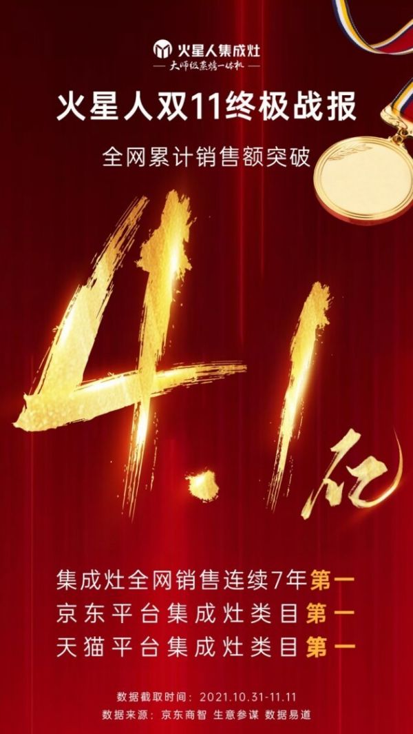 今年双十一,火星人集成灶携30系列新品提前亮相,从10月20日预售开始,22日新品正式发布揭晓,到截止11月11日24时,该新品系列天猫、京东销售订单已达16000+台,持续爆单,已然成为双十一集成灶超级爆款。同时,火星人线上销售额4.1个亿,销量连续7年实现行业前列。