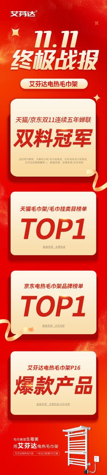 天猫生意参谋数据显示,双11期间,“艾芬达”品牌位居天猫毛巾架/毛巾挂类目榜首。京东商智数据显示,“艾芬达”品牌夺得电热毛巾架品牌榜单TOP1。艾芬达电热毛巾架P16款更是成为双11爆款单品,广受消费者们的青睐。