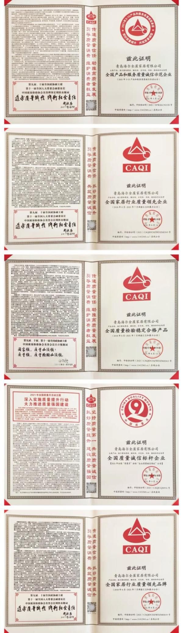 新浪定制频道讯 近日,国家市场监督管理总局等多个部门联合开展2021年全国“质量月”活动,中国质量检验协会(CAQI)授予青岛海尔全屋家居有限公司《全国产品和服务质量诚信示范企业》、《全国家居行业质量领先企业》、《全国质量检验稳定合格产品》、《全国质量诚信标杆企业》和《全国家居行业质量领先品牌》五项殊荣。