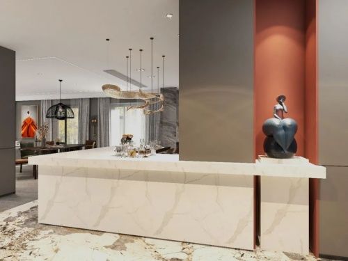 厨房、餐厅形成连贯的生活轴线,将功能缜密地布局于角落,空间开阔、动线流畅,惬意的生活就此开场。石与木的搭配、深与浅的交织,保留了选材的清雅个性,又保持了色彩的高级与舒适,几许悠然,极具东方灵气,自在惬意。