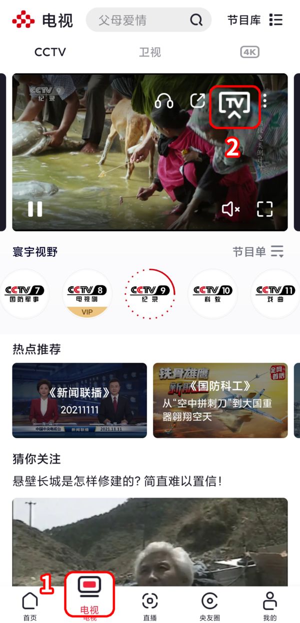 手机应用商店下载央视频。安装完成后,打开央视频,点击菜单栏的电视,再找到想看的频道,点击带有TV的功能键,选择投屏至电视即可观看。