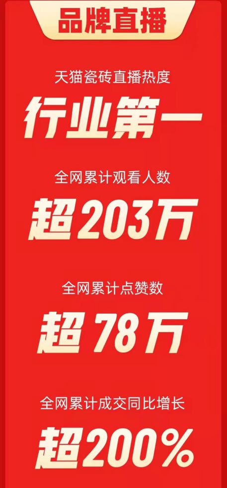 在天猫平台,诺贝尔品牌渗透率稳步提升,取得天猫装修建材行业品牌榜第一。其中,本次诺贝尔双十一实现线上线下的一体化,商品一体化,同款同价,使得留咨数量、成交率和成交金额的显著提升,并且在第二场天猫总裁直播中,诺贝尔直播间观看人数突破20w!直播间成交额同比增长超185%!直播间热度高居天猫瓷砖行业第一!