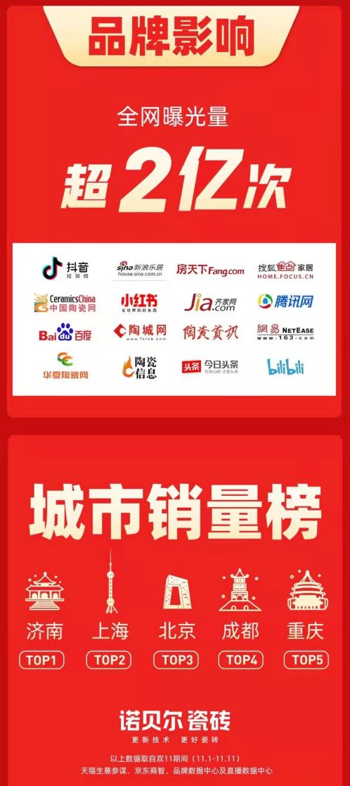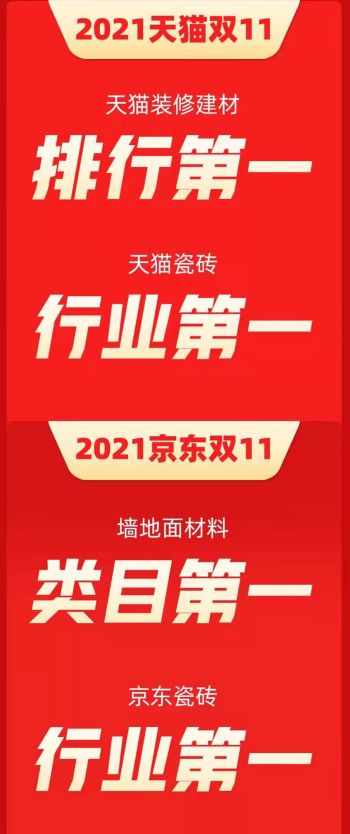 诺贝尔瓷砖2021“双十一大促”终极战报来啦!多品类产品销售火爆,全网数据行业领先:10月20日至11月11日双十一大促期间销售再次问鼎天猫/京东瓷砖行业销量冠军、全网累计203万粉丝参与观看、全网累计成交同比增长200%!在2015年-2021年天猫/京东双十一活动中,诺贝尔瓷砖获得了8次瓷砖行业销量冠军,是中国陶瓷行业首个八冠品牌!