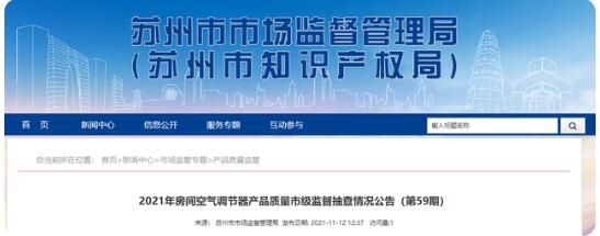 11月12日,江苏省苏州市市场监督管理局网站发布《2021年房间空气调节器产品质量市级监督抽查情况公告(第59期)》。