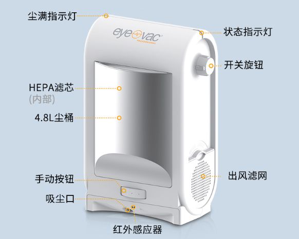 EyeVac采用先进的工艺和技术,在海外国家,已经经过多年的使用认证。EyeVac吸尘器稳定高效,运行平稳。1400w高强力吸尘,红外线自动感应,在启动的瞬间即可吸走地面上的垃圾。