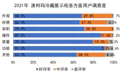 2021年度,冷藏展示柜用户总体满意度(好评率+差评率)为94.9%。其中,澳柯玛的用户满意度为96.2%,高于总体1.3个百分点。其中消费者对澳柯玛功能、操作质量等三个指标满意度最高。