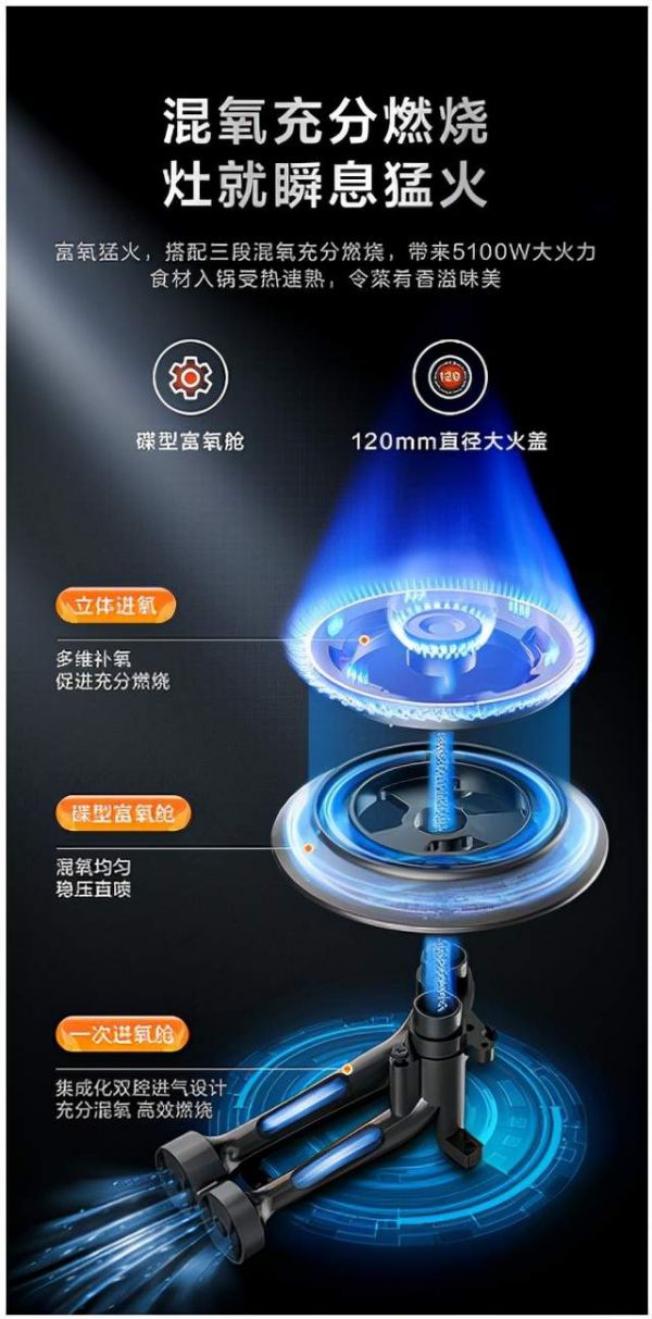 富氧纯焰,充分燃烧提高烹饪效率