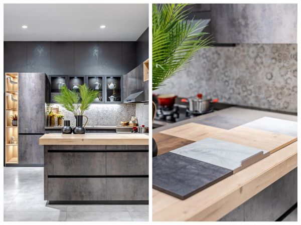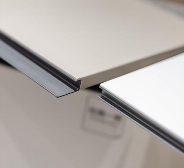 工业装修风格看似粗犷,实则细节上极其讲究。据店员介绍,阿玛尼7s在工艺上采用高级零度压贴工艺,表面呈现真实的锈纹肌理。食品级的德国瑞好同色封边条,增加厨柜质感;当然还有隐形拉手设计,美观又实用。台面有多色可选搭。