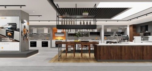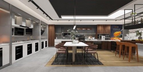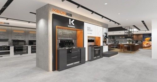 科恩新门店简约、大气、精美的视觉冲击让人印象深刻,开放式浏览路径,通过“视觉+产品+体验”的融合,以差异化彰显品牌个性,让消费者通过感知产品来感受品牌,对多个区域进行场景重构,产品陈列区、厨房场景、品牌背书、洽谈区等,通过模块化的方式,将核心产品模块以及开放式厨房体验场景植入门店。