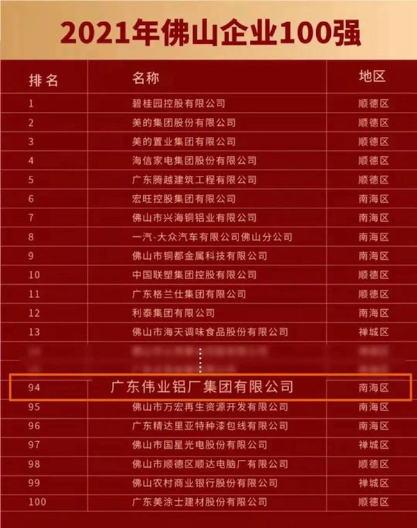 新浪门窗频道讯 11月20日,由佛山市企业联合会、佛山市企业家协会主办,佛山市总商会联合主办的“2021佛山企业家活动日”,重磅发布2021年佛山企业100强、制造业100强。广东伟业集团入围“双百”榜单,位列佛山企业94位,佛山制造业49位。