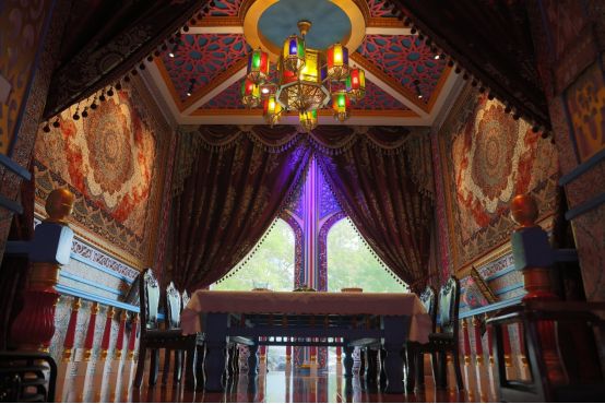 【宋涛】我们在作案的时候,当时亲临了新疆的各个地方,我们做了考察,包括色彩,包括所有的这种造型,包括你入口的进入,个人的体验,包括西域文化的这种创造,包括每一个造型,我们都是按1:1最原始的东西来去把它拿过来,然后根据我们的手法去改造,再结合现在的这种流行的趋势,打造一个网红的餐厅,让大家更多的了解新疆的城市的美。因为这个案子他有好几个分店,对于这个分店来讲,打造的就是一个可以打卡的地方,让大家知道在新疆还是有彩色的,所以说在这个案子里头呢,包括每一个细节,顶上那一些镂空的花纹,包括这种桃形状的这种拱形的,包括很多地毯,瓷砖,都是从新疆或者从国外特意拿来的,选购符合这个空间的一些造型,来去演变。其实就几大板块,如果提到色彩的话,其实新疆就是以红,蓝,玫红,墨绿,白色,黑色,金色,基本上就是七八个颜色,你比如说白色那就是雪山,有可能你的红色代表那个鲜艳的水果,它很直观地看到颜色的分类,所以说我们希望把这颜色组合到一块儿去做这么一个案子。其实这个是非常非常难的,因为在好多做新疆餐厅的时候,你拿到这个案子的时候你会发现,你必须把它做到更加的去像那个城市的东西,有可能别人认为只是一个造型而已,但是作为我们来讲,我们希望把哪怕一个柱子,哪怕一个造型,希望能让它做得还原度更高一些,所以说费了很大的功夫。