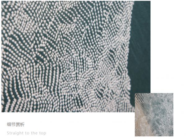 全套装饰画仅白色一色,近55万针的花纹刺绣针法,起伏的白色点状刺绣翻涌成山脉,轻松而又没有压力,山象征着崇高的德行与品格。