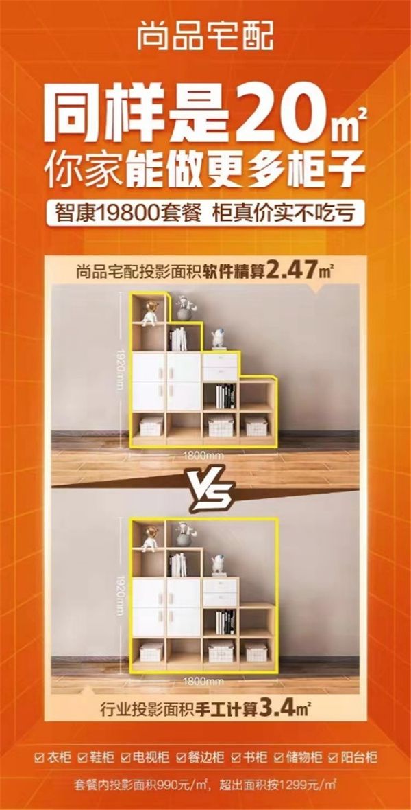 更让人感到惊喜和意外的是,软件可以精算定制家具的投影面积。行业中对于投影面积一般是手工计算,总会有些许误差。但是利用软件进行精算后,同样的平米数,或者同样的价格,在尚品宅配这里能做更多的柜子。为用户精打细算省钱的家装公司,尚品宅配称得上是第一个了!