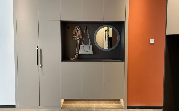 家的第一道风景线,门厅鞋柜配备了自带灯光的圆镜,保证美美的出门;不落地设计,方便回家进门轻松换下常穿鞋,将一天的疲惫留在门口。